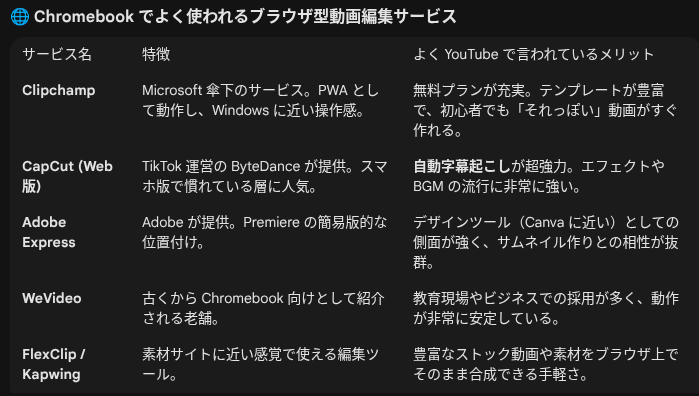 なので、Chromebook1台でやったる!という人は圧倒的に相性が良いです。私が動画で見た方によれば、本格的な動画編集はできないかもしれないがそこそこできる、と言っていました。