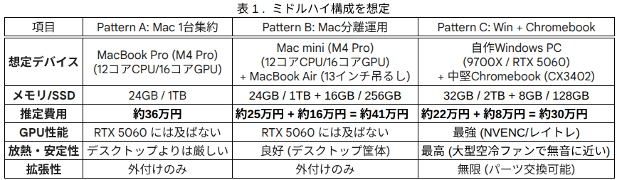ミドルハイでは、OS統一で分離運用しようとすると高くつきます。そのため、このスペック帯の場合、1台に集約するか、OS2種類でChromebookと自作PCを組み合わせる方が合理的です。