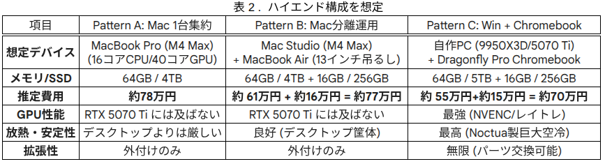 ハイエンドでは、1台運用とOS統一の分離運用の差が縮まります。一方でOS2種類でChromebookと自作PCを組み合わせる構成は依然としてコストパフォーマンスの良い選択肢になります。